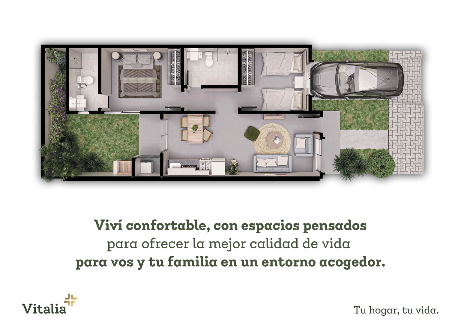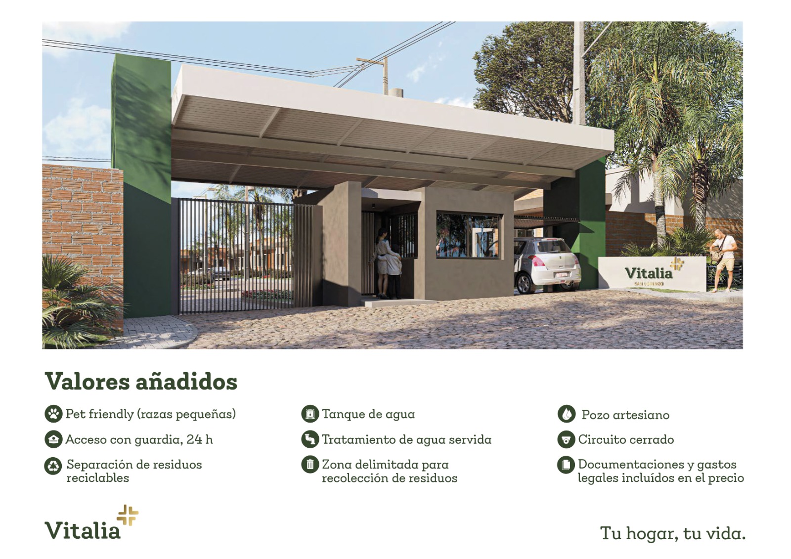 Viviendas de 2 habitaciones, 1 en suite, lavadero techado, estacionamiento techado, jardín delantero, patio trasero, barrio cerrado con varios amenities, con áreas para posibles ampliaciones, techos termoacústicos, conexiones de AC y ventiladores, Areas comunes: canchas multiusos, parque infantil, generador en áreas comunes, quincho con parrilla, senderos para caminatas. Pet Frendly, acceso con guardia 24 horas, entre otros.