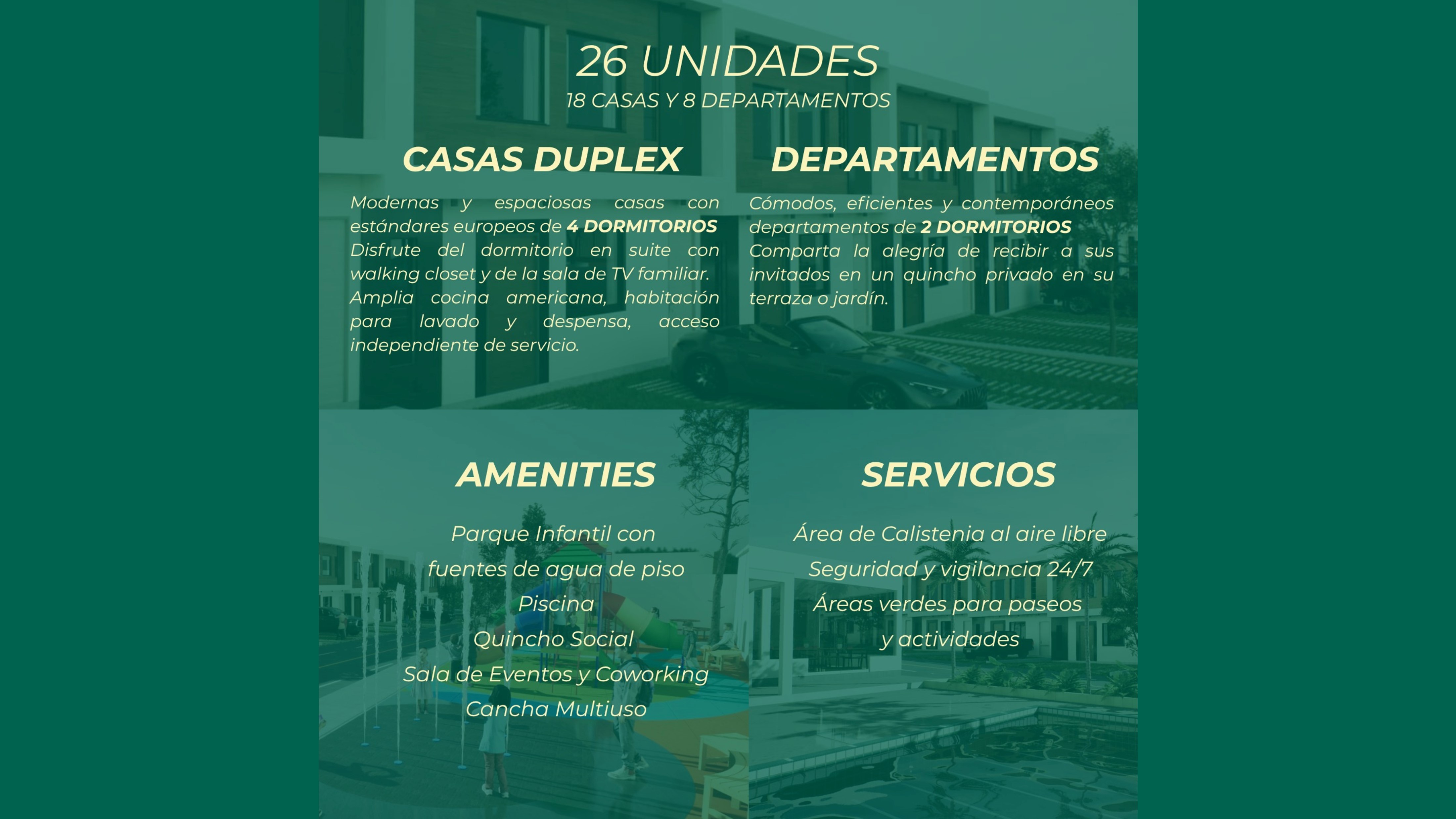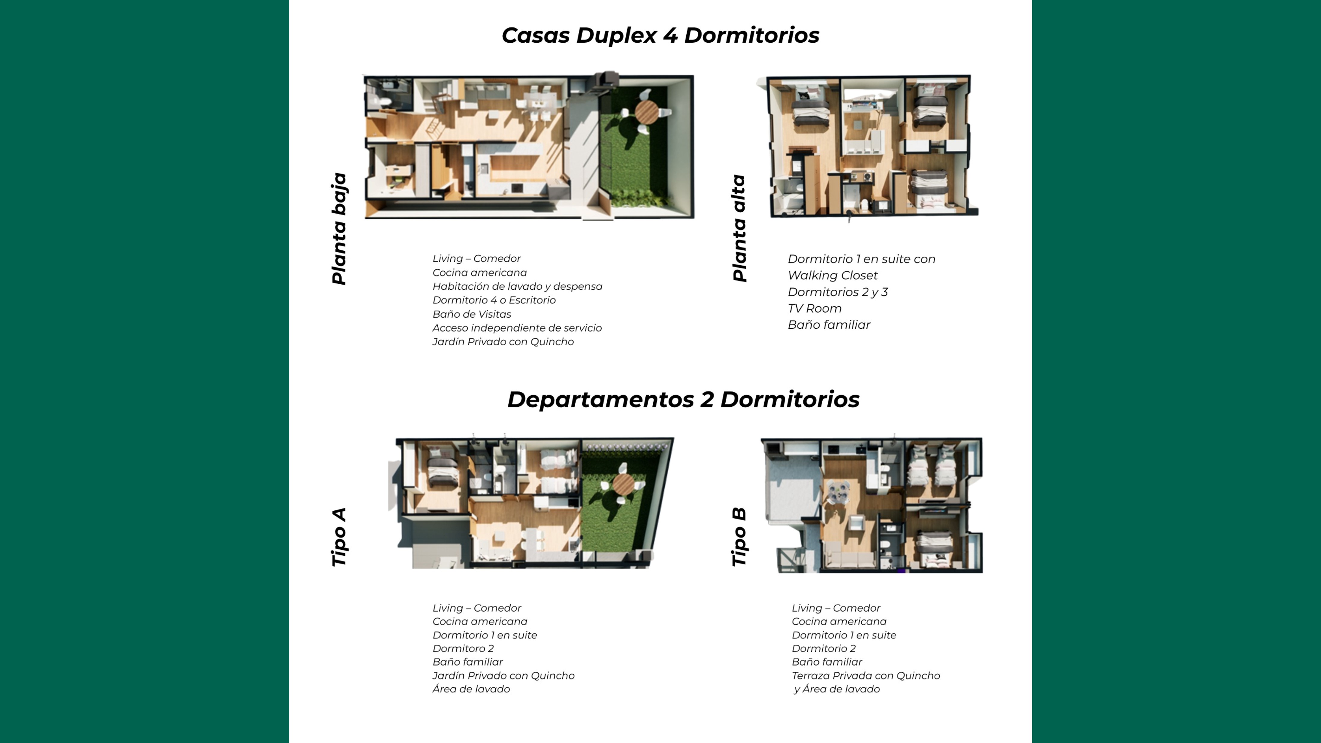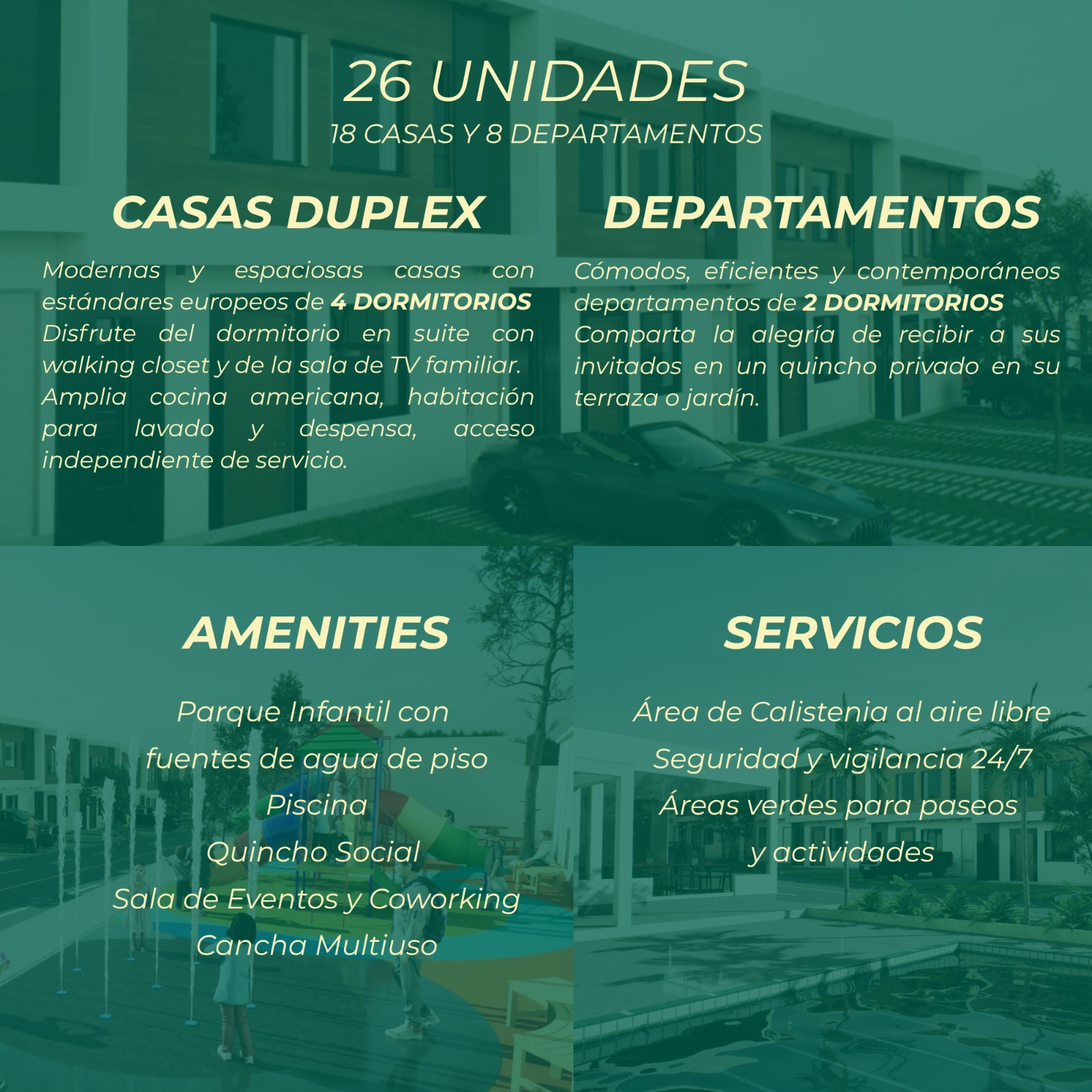 En un predio de 5.000 m² nace un Barrio Cerrado exclusivo, seguro e íntimo, diseñado bajo los valores de Comunidad y Familia. Ofrece 18 dúplex de 154 m², con 4 dormitorios, acceso de servicio, jardín, quincho y 2 cocheras; y 8 departamentos funcionales, con jardín o terraza, quincho y 1 cochera. Entre sus amenities destacan piscina, cancha, parque, área de calistenia, parque de aguas saltarinas y seguridad 24/7, creando un entorno ideal para vivir con confort y tranquilidad.